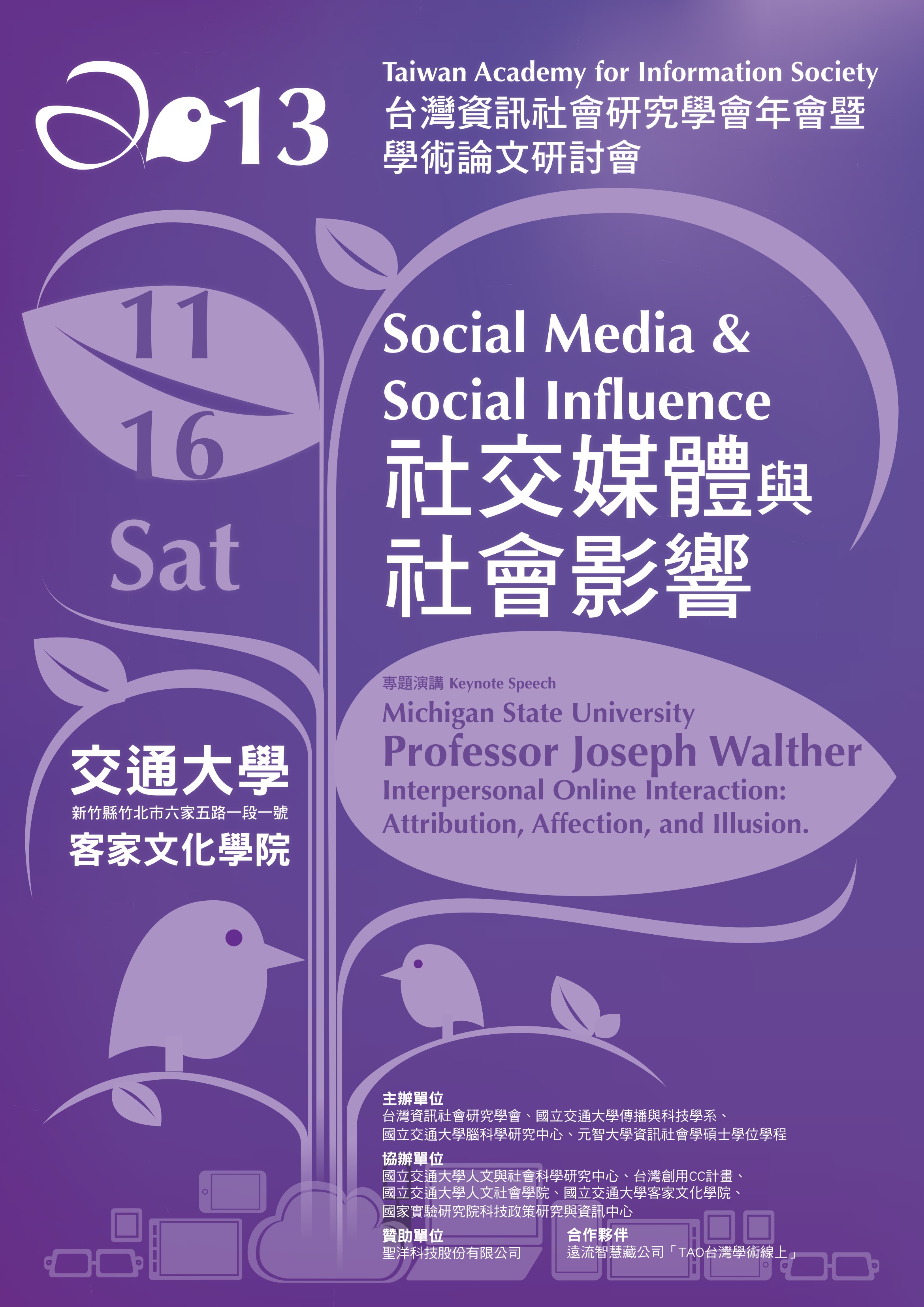 2013/11/16將於交通大學客家文化學院(新竹縣(30272)竹北市六家五路一段一號),舉辦2013年台灣資訊社會研究學會年會暨論文研討會。