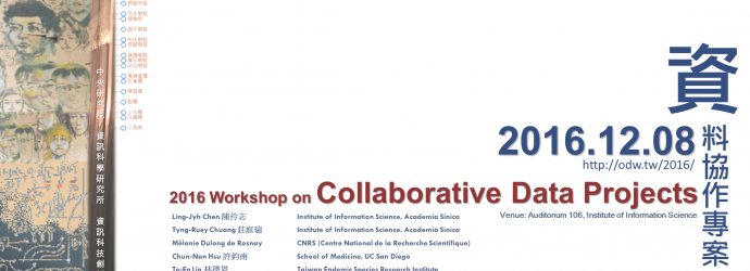 The 2016 Workshop on Collaborative Data Projects will be held on December 8, 2016 at Academia Sinica in Taipei. The purpose of this workshop is to call on the attention of the wider research community to share best practices in collaborative data projects, to discuss common issues, and to propose directions for actions.