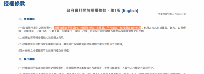 2015 年 7 月 27 日訂定並公告生效的「政府資料開放授權條款-第 1 版 (Open Government Data License version 1.0, OGDL-1.0)」,是一個對使用者非常親善,且鼓勵再行衍生利用的授權模式。只不過,對於公務單位來說,要提供如此大範圍的授權利用,依傳統模式原則上僅有公務人員自行產製的編輯著作,或是採購契約上明定機關取得所有權利的素材,才適合採用 OGDL-1.0 進行公眾授權。