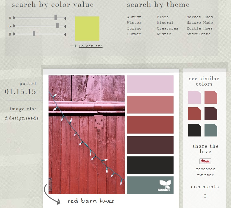 在 這個網站,Jessica分享許多美麗照片和從該照片抓出來的顏色,讓對於色彩不夠敏感的一般人,透過這些照片瞭解可以如何搭配不同色調顯示出自己想傳達 的感覺。事實上,這個網站就提供了從主題查詢顏色的功能,讓人知道如果自己想要傳達秋天的感覺可以怎麼配色。(如果喜歡他的照片,也可以追隨他的 instagram,至於一些比較早的照片則是他付費購買圖像版權後使用的,很可惜許多照片他都忘記出處網址了)