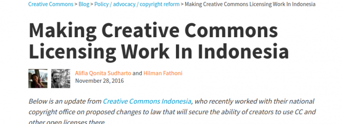 Making Creative Commons Licensing Work In Indonesia at: https://creativecommons.org/2016/11/28/making-creative-commons-licensing-work-indonesia/