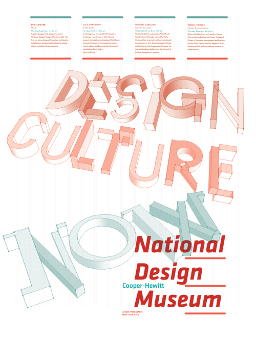 比方,這張Design Culture Now就是John P Corrigan教授給秋季課程的設計系學生參考的教學範例,透過一系列數張為National Design Museum的Design Culture Now活動海報,來解釋當中的印刷和手寫字體、背景、配色、排版等知識與技巧。